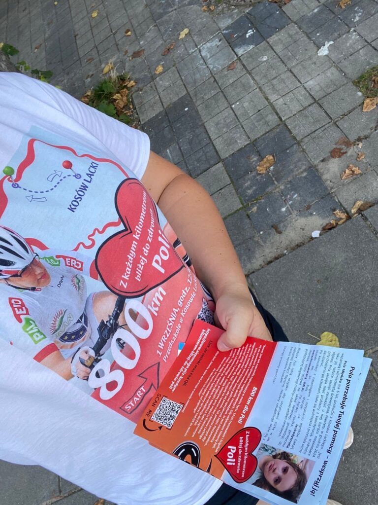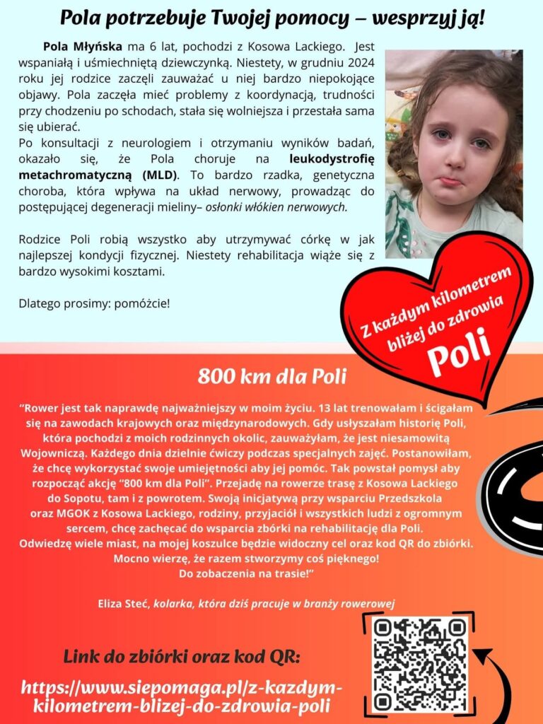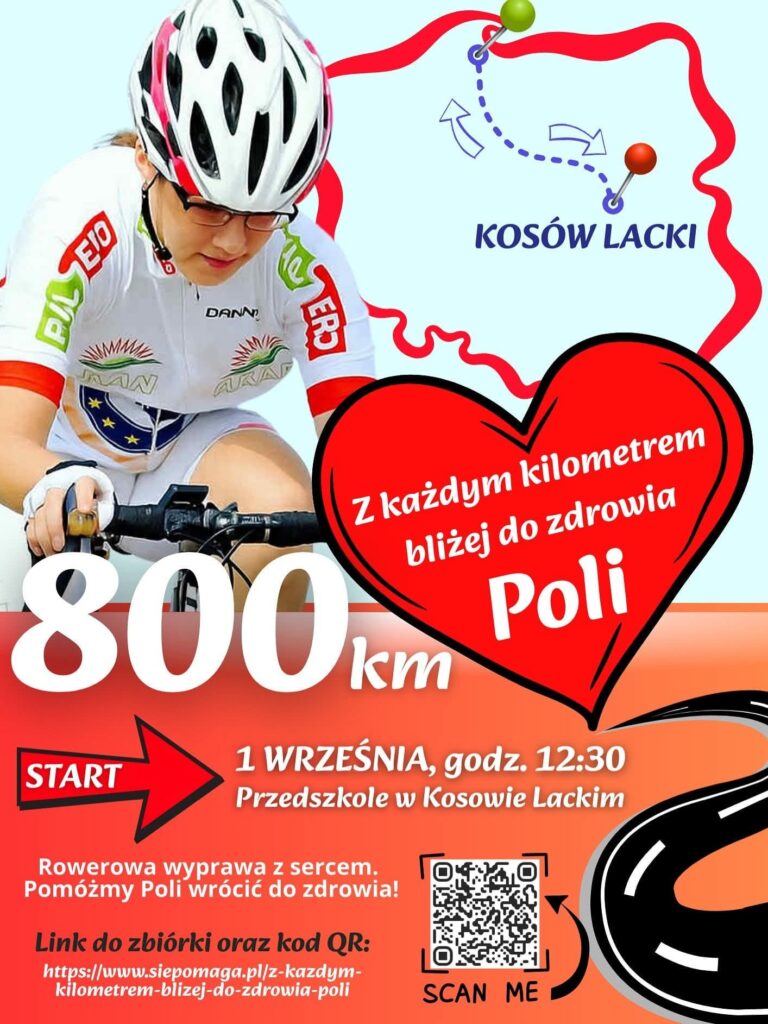 Eliza Steć, kolarka z Kosowa Lackiego, przemierza na rowerze trasę do Sopotu i z powrotem, by wesprzeć leczenie i rehabilitację 6-letniej Poli, chorej na rzadką, genetyczną chorobę układu nerwowego. Akcja „800 km dla Poli” połączona jest z publiczną zbiórką funduszy.