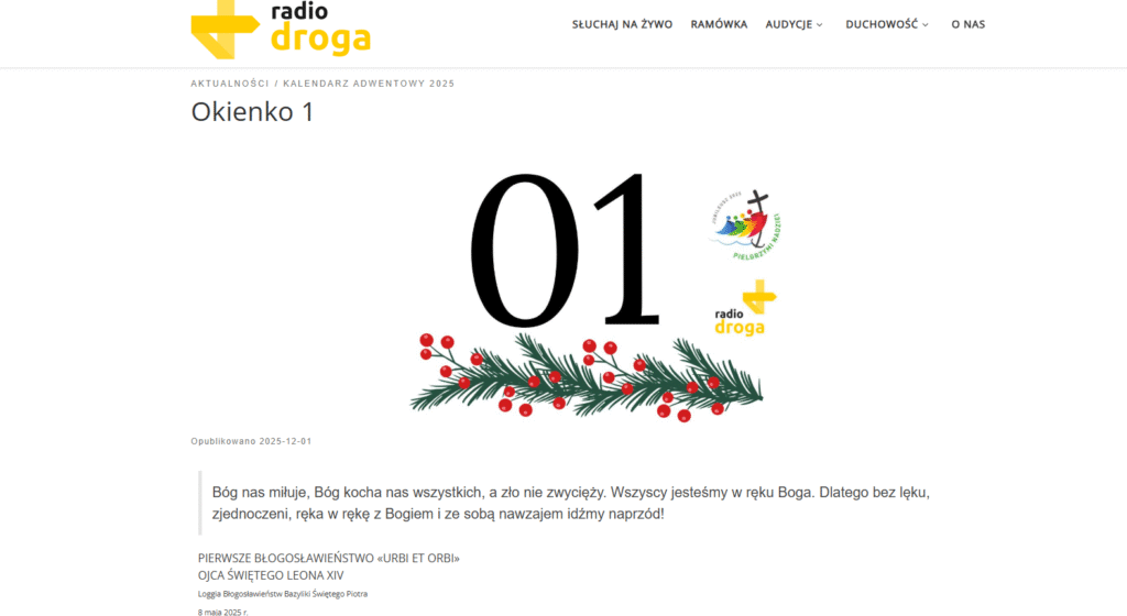 Kalendarz jest dostępny na stronie internetowej Radia: https://radiodroga.net/kalendarz-adwentowy-2025/